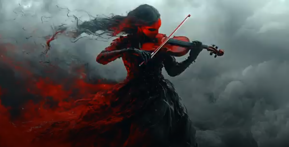 Prompt: สร้างวีดีโอผู้หญิงใส่หน้ากากสีแดงชุดสีดำสไตล์กึ่งแวมไพร์ ฉากพื้นหลังมีหมอกควัน กำลังสีไวโอลิน เน้นที่ตัวผู้หญิง
