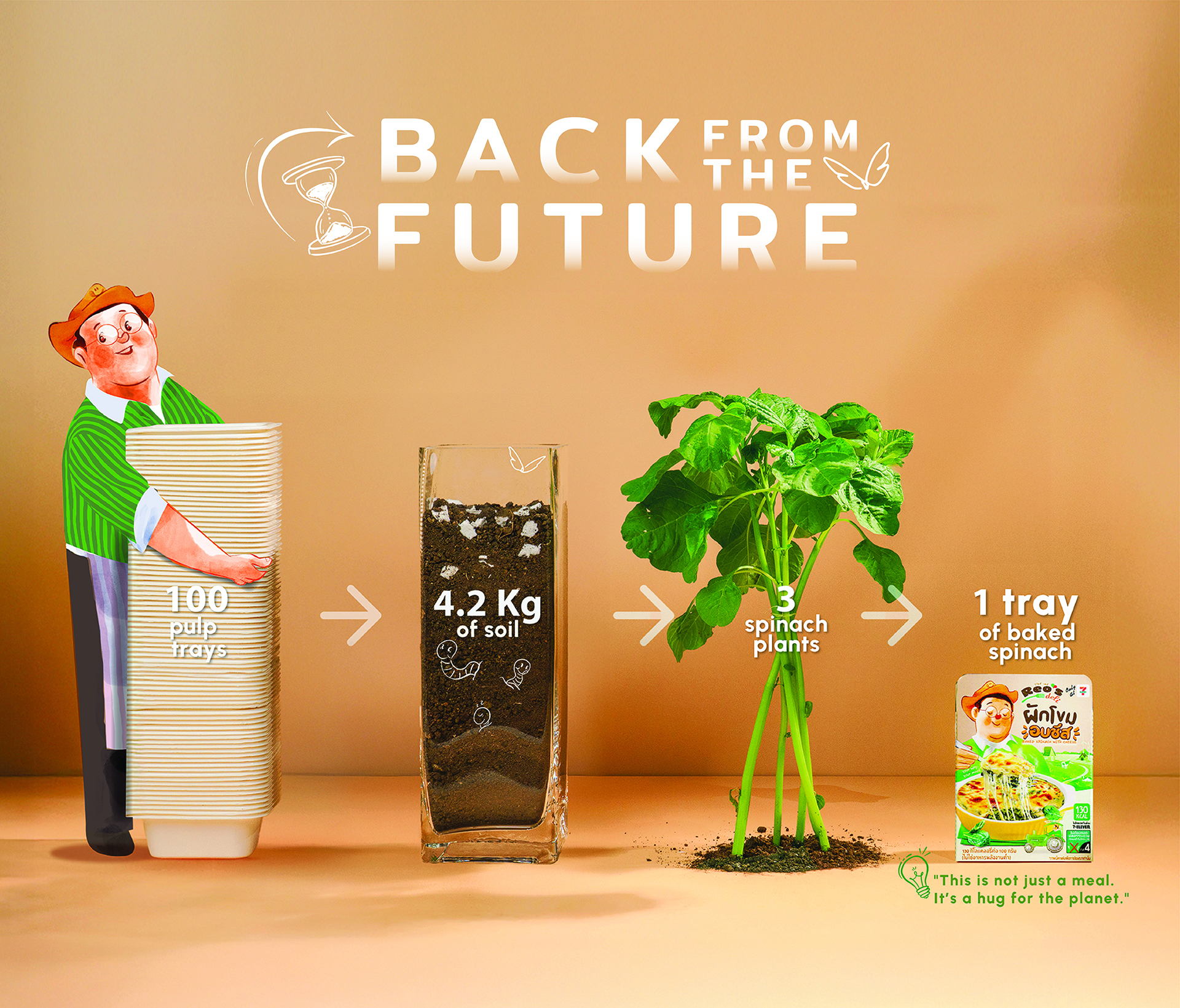 ผลงานนี้ถูกออกแบบภายใต้แนวคิด “Back from the Future” โดยพัฒนาถาดบรรจุอาหารจากพลาสติกแบบเดิมให้กลายเป็น ถาดเยื่อพืชย่อยสลายได้ เมื่อใช้งานเสร็จ ถาดสามารถคืนสู่ดิน กลายเป็นปุ๋ยอินทรีย์สำหรับเพาะปลูกผักโขมรุ่นใหม่ ก่อนจะหมุนเวียนกลับมาเป็นส่วนหนึ่งของเมนูผักโขมอบชีสอีกครั้ง สร้างวงจร Circular Economy ที่จับต้องได้จริงในรูปแบบ “กินแล้วปลูก – ปลูกแล้วกิน”